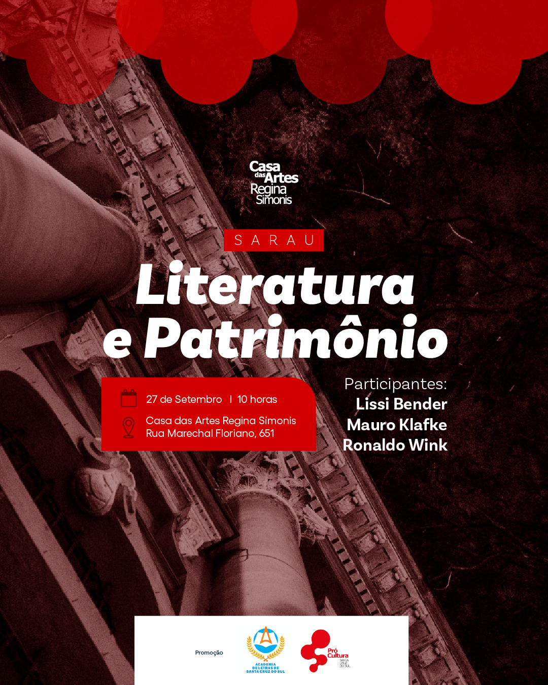Sarau Literatura e patrimônio Participantes: Lissi Bender, Mauro Klafke e Ronaldo Wink Dia 27/09 – 10 horas Na Casa das Artes Regina Simonis Promoção […]