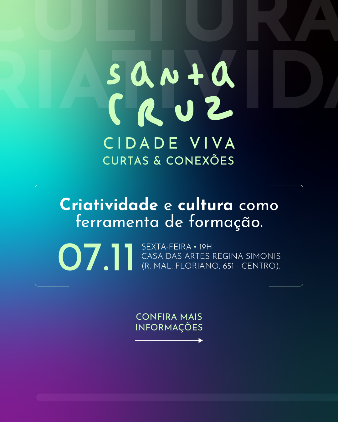 No dia 07 de novembro, às 19h, a Casa das Artes Regina Simonis recebe uma nova programação do projeto “Santa Cruz Cidade […]